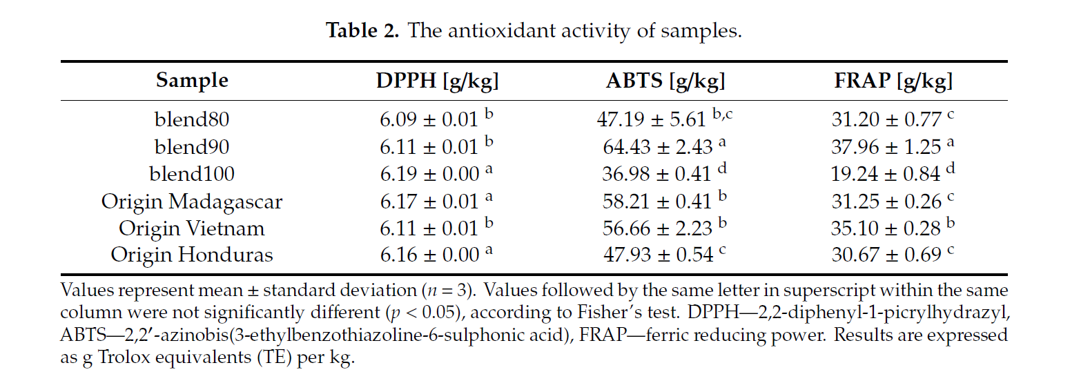 Table 2 showcases the observed antioxidant activity of the 6 samples using 3 different methods of determining antioxidant activity/capacity.