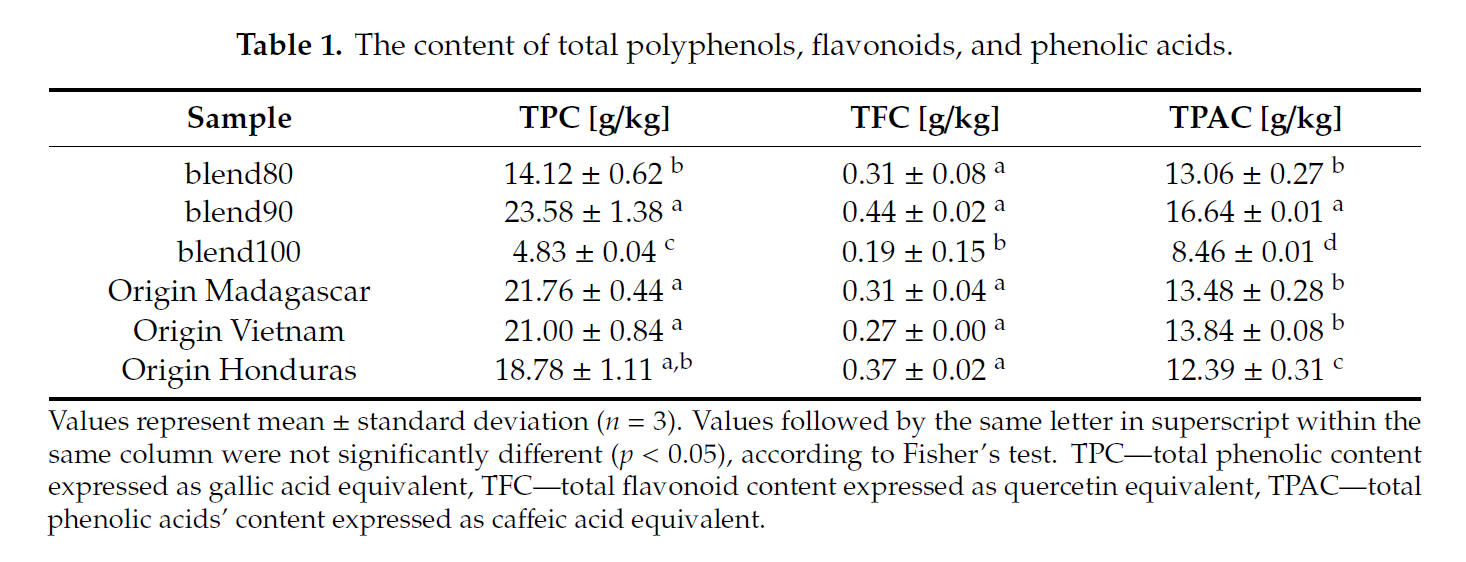 ABTS shows that the highest antioxidant activity was found in the blend90, and lowest in blend100, which positively correlates with total polyphenol and phenolic acid content. The values found for single-origin were higher than the blend100, but comparable to the blend80 and blend90.