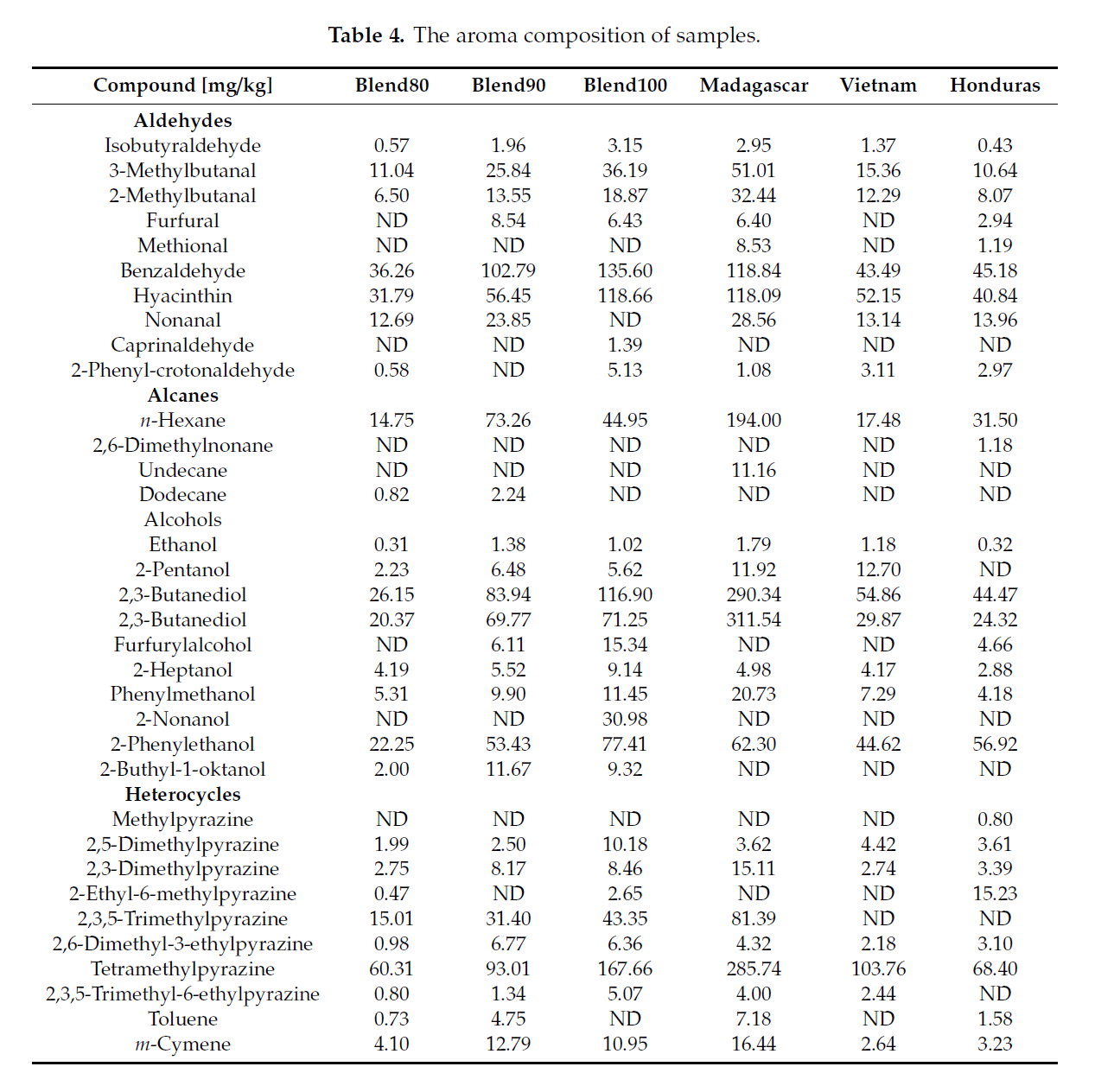 The aldehydes 3-methylbutanal and 2-methylbutanal are also considered important to quality chocolate flavour, and were found to be highest in the Madagascar origin. The most present alcohols were 2,3-butanediol, and is a desirable aroma identified in chocolate. High levels of alcohols are often characterised with floral notes. Esters are also very important, and contribute to many fruity and floral notes, but can be found in both pre- and post-fermented beans. The most prominent ester identified was phenyl acetate, which has a floral and rose-like aroma.