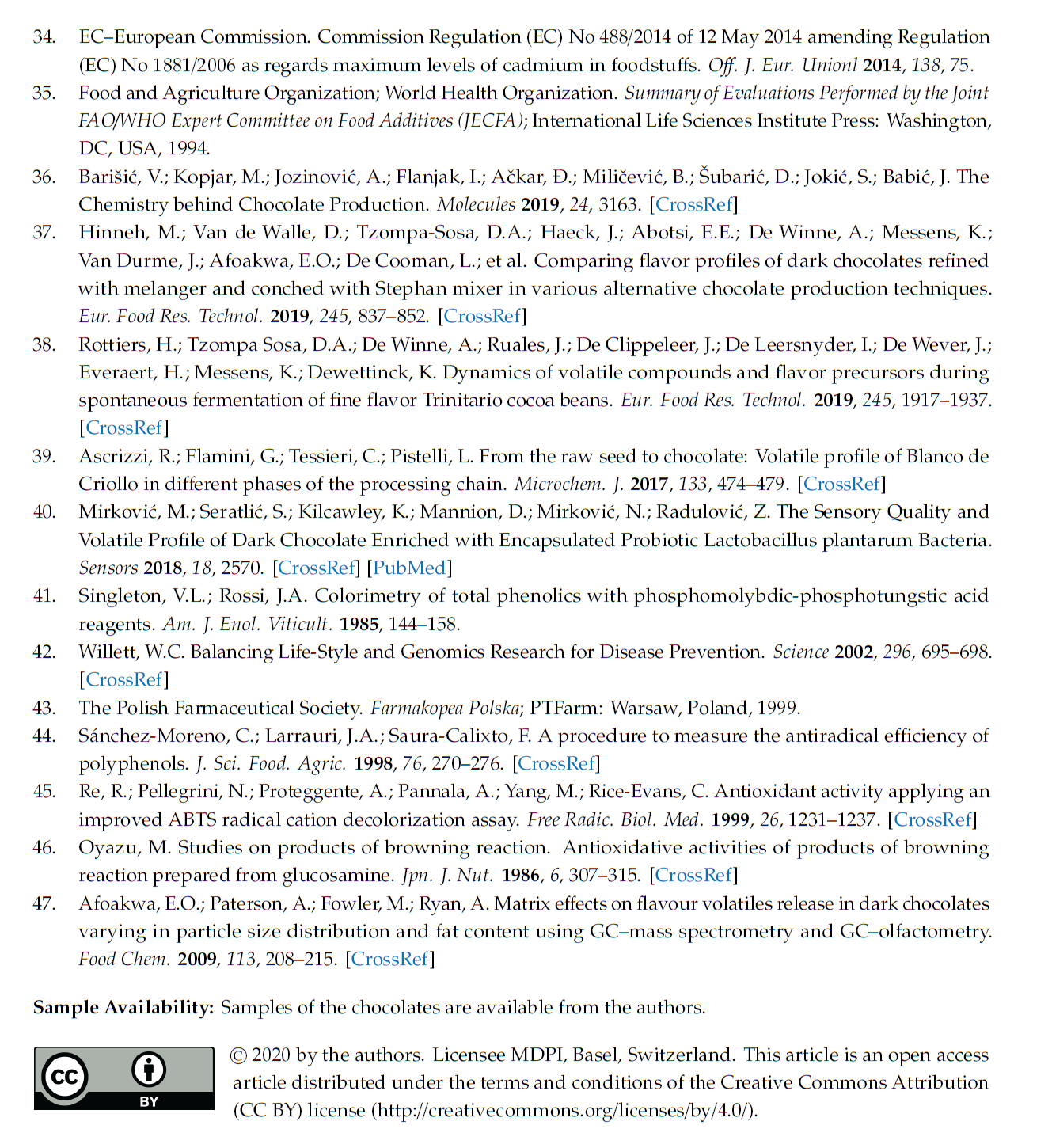 Levels of potentially toxic elements ranged from 0.0002 to 0.0006 mg/g for lead (Pb), and 0.0002 to 0.0003 for cadmium. Cadmium can be tolerated at extremely low concentrations, so the levels for Cd permitted in chocolate and other foods are set quite low by many countries. The limit in the EU was set to 0.8 mg/kg in chocolates wit 50% or more of cocoa solids. None of the samples here exceeded this limit. Acceptable daily intake of Aluminium (Al) is 1 mg/kg body weight, which would not be easily reached by consumption of dark chocolate on a daily basis. The levels of aluminium was found in the same samples that contained low levels of cadmium (blend90 and Madagascar).