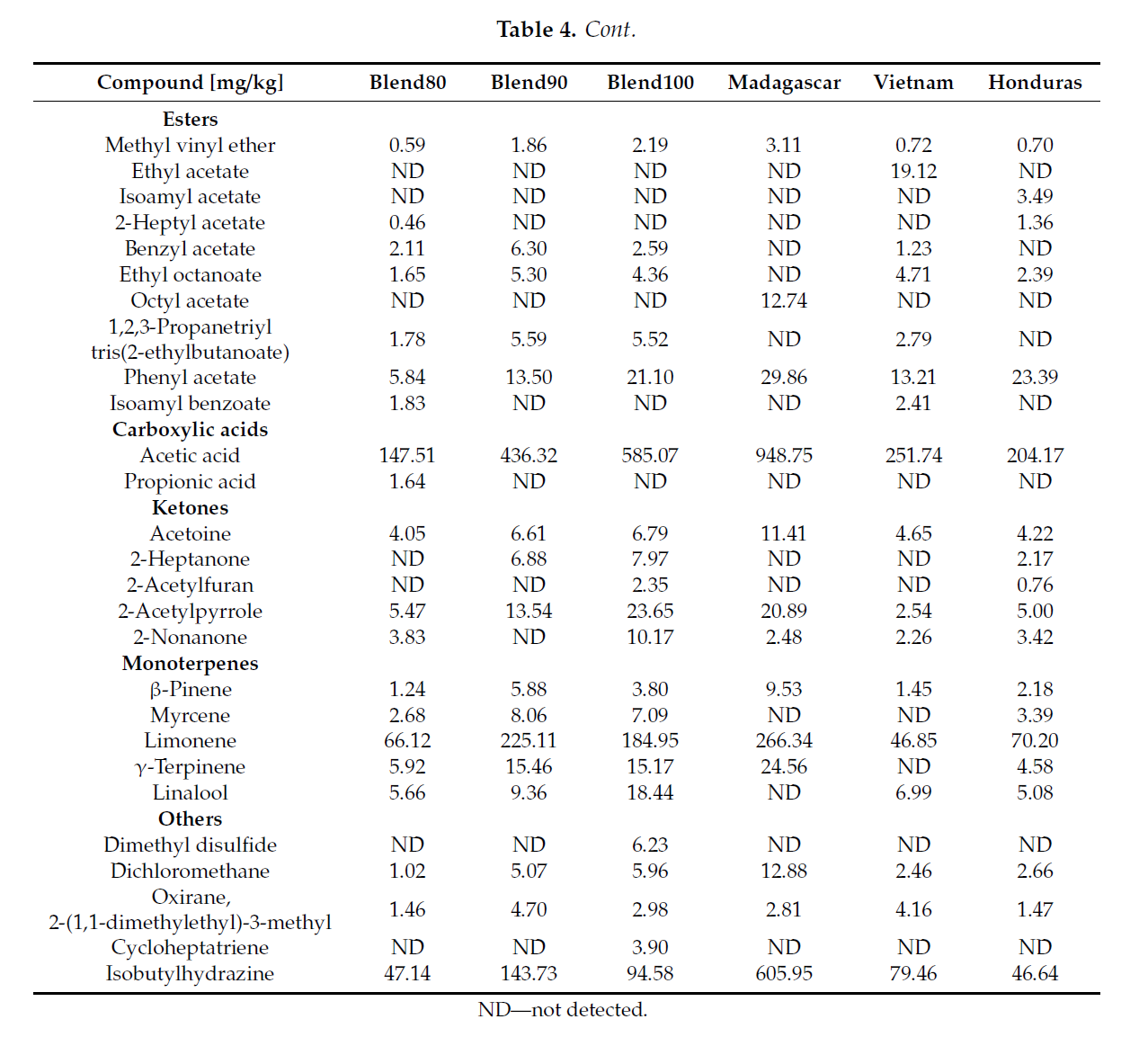 The predominant compound in all samples was acetic acid. Much of the acidic acid in cocoa beans comes from the fermentation process, which is necessary to allow enzymatic reactions and improve the quality of the cocoa beans. However, volatile acids are not desirable in cocoa beans or subsequent chocolate, especially at high levels, and may result in poor flavour. Higher levels of acids could be a result of drying post-fermented beans too quickly trapping the acids inside the bean. However, levels that are too low may be related to loss of a proper chocolate taste (36).
