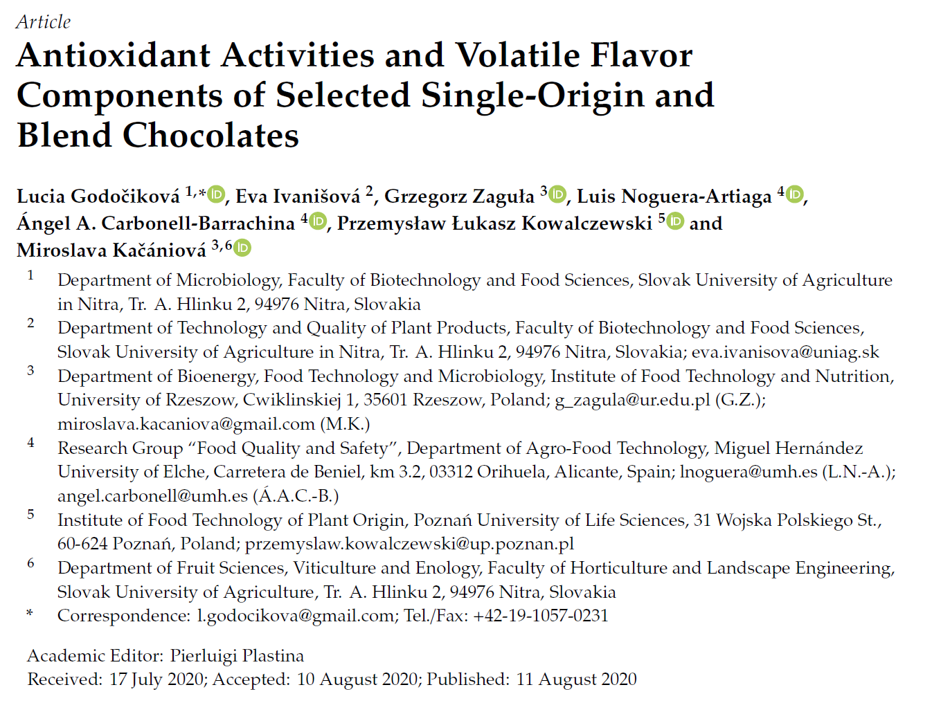 Cocoa beans and chocolate are rich in antioxidants, mainly catechins, anthocyanins, and proanthocyanidins. The main catechin found in cocoa is (-)-epicatechin. The concentration of the various antioxidants differs among cocoa beans and chocolates, and therefore this difference will influence the antioxidant value from chocolate to chocolate. Table one displays the total phenolic content (TPC), the total flavonoid content (TFC) and the total phenolic acids (TPAC) of the 6 unique chocolate samples.