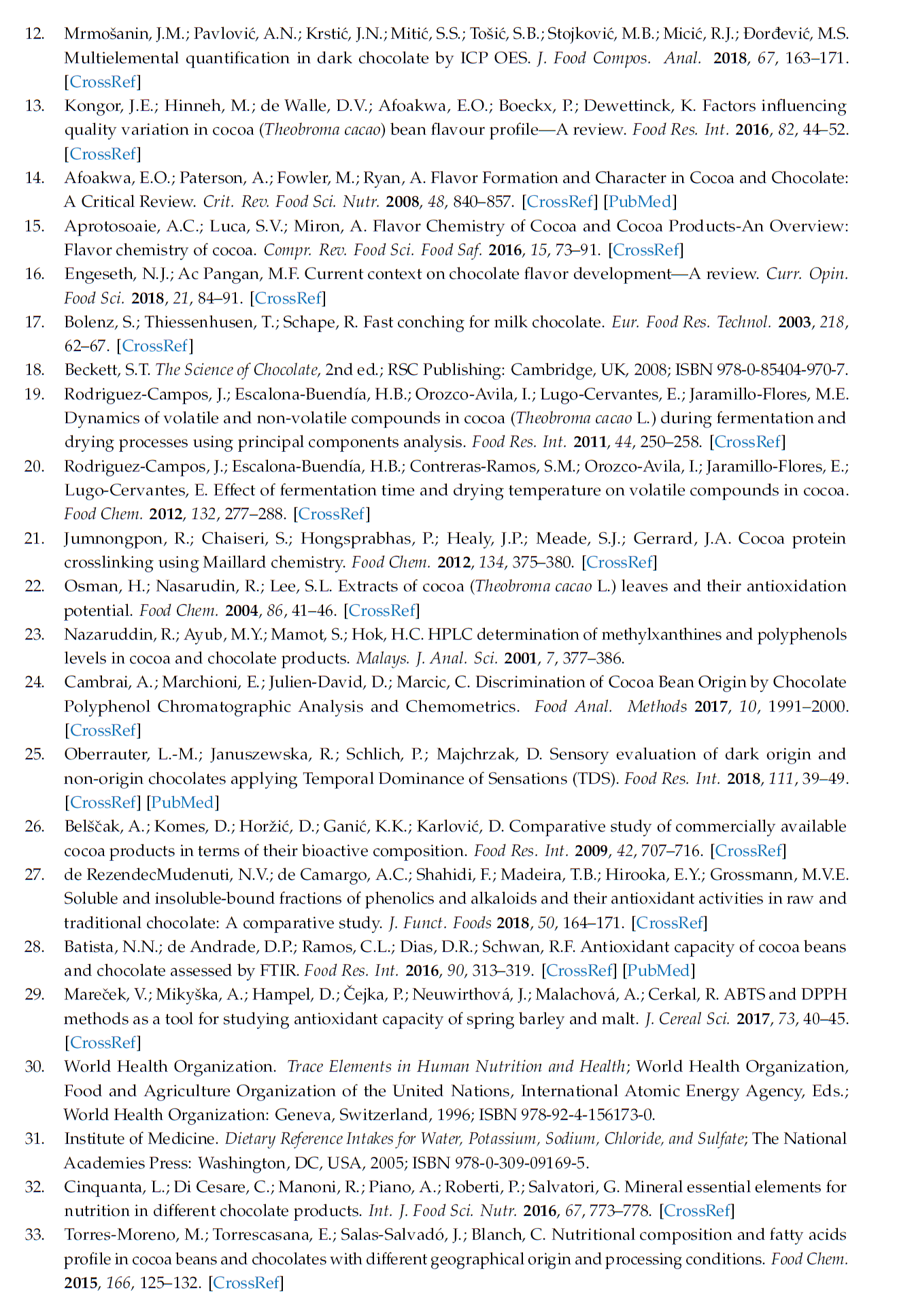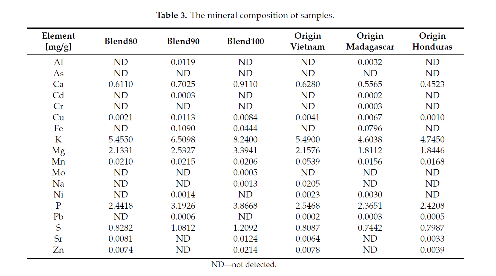 A total of 18 elements were determined in the 6 chocolate samples (see Table 3). Elements can be divided into macro (Ca, K, Mg, Na, P, and S) and trace elements. The trace elements were divided into 3 groups: Essential (Cr, Cu, Fe, Mo, and Zn), Probobly essential (Mn, Ni), and potentially toxic which may have essential functions at low levels (Al, Cd, Pb, and Sr).