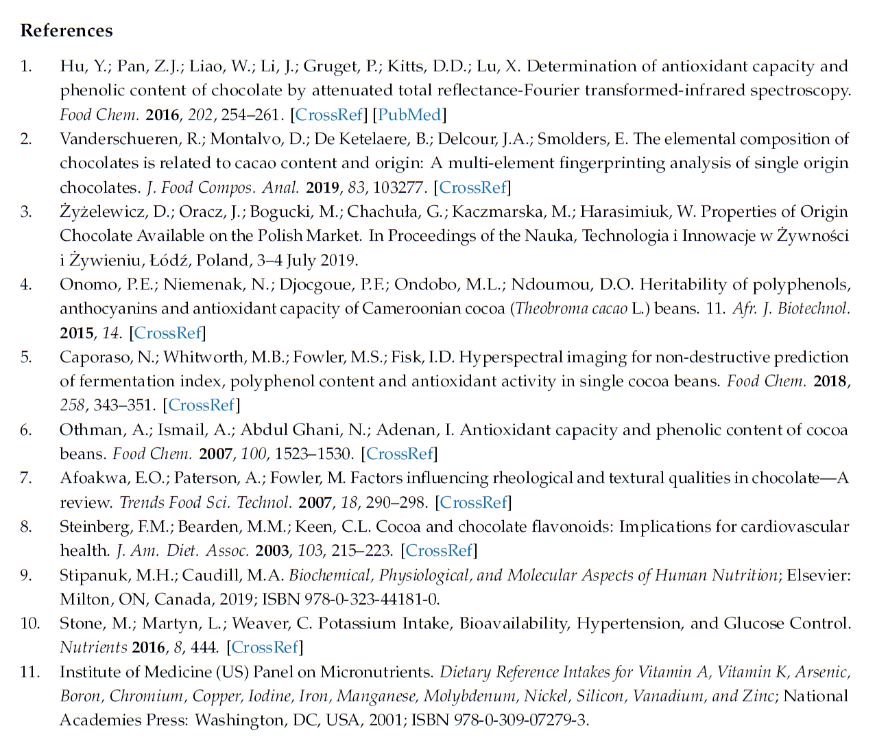 Chocolate is not only high in polyphenol content, but also in many minerals such as magnesium, potassium, copper, iron, and more. Their concentration is highly influenced by the percentage of cocoa solids in the chocolate (dark having more than milk chocolate). Since metals can have positive and negative roles depending on concentration, its important to be able to identify them in foods.