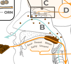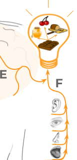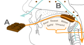 An overview of how we perceive flavour. A Chocolate is consumed and taste buds in the mouth receive information. B After swallowing, exhaled air pushes the aroma molecules into the nasopharynx. C Olfactory receptor nerves (ORN) are stimulated by the aroma molecules and send this information to the Olfactory Bulb (OB). D The information gathered within the OB is transferred to the Olfactory Cortex (OC). E It is combined with information from all our other senses and processed in our brain which includes the areas of memory and emotion. F All this combined forms our retronasal flavour image.