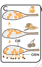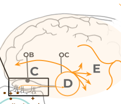 The image here depicts the same olfactory bulbs three times, but little circles within it are the glomeruli. Specific aroma molecules activate specific neurons. These neurons meet in the Olfactory Bulb (OB), and match up with other like neurons with the same receptors into the glomeruli. Depending on which neurons become excited, their corresponding glomeruli create a pattern in the olfactory bulb. It is this pattern which represents what the aromas are.